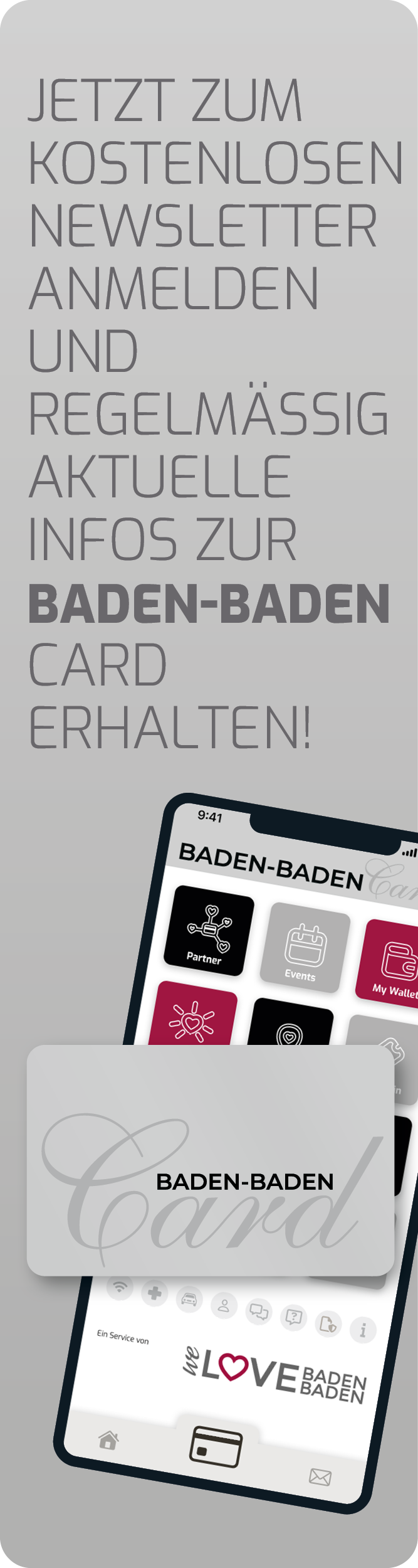 Die Baden-Baden CARD ist für Sie kostenlos bei teilnehmenden Partnern erhältlich. Eine aktuelle Übersicht der Partner finden Sie hier.